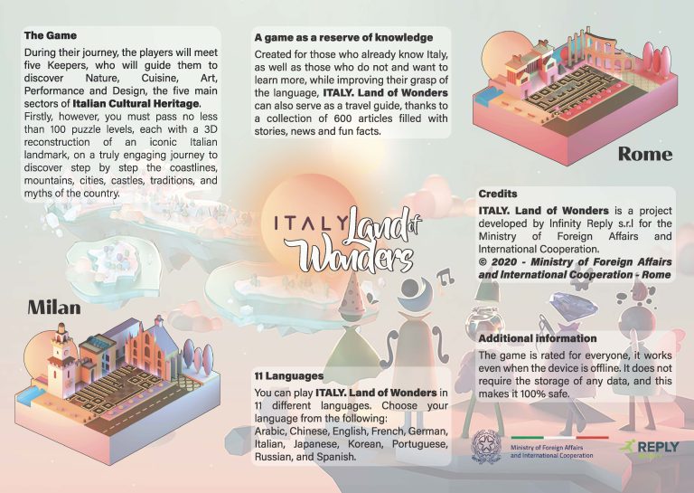A folded A4 flyer and a promotional banner designed for the Ministry of Foreign Affairs and International Cooperation, presenting the mobile game Italy. Land of Wonders.